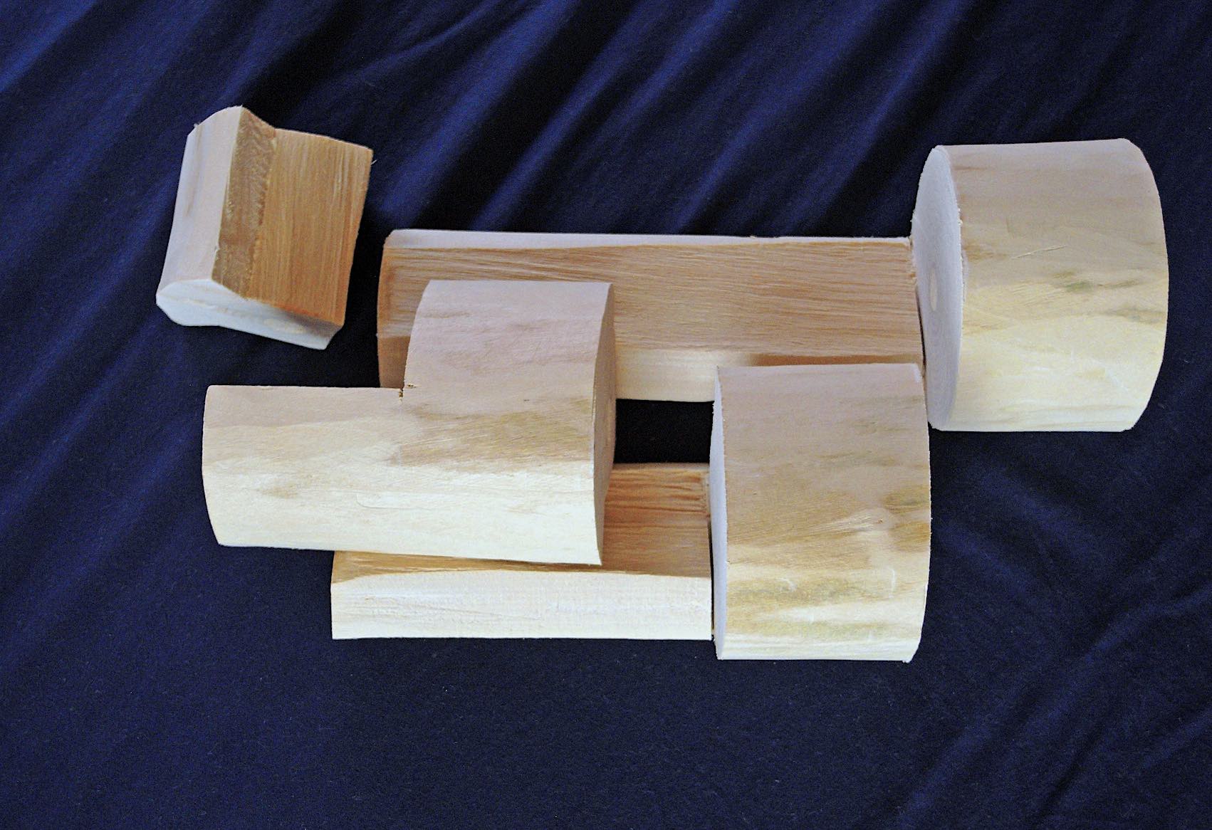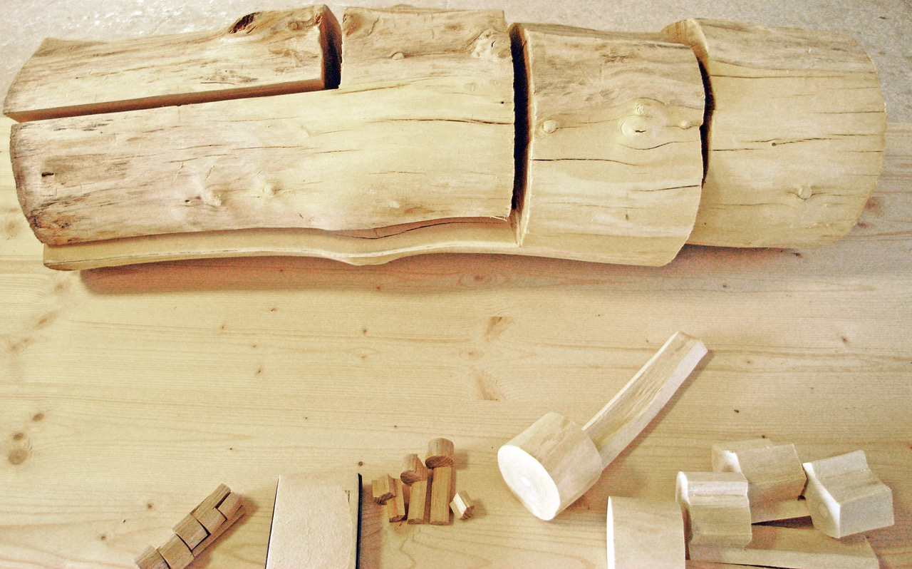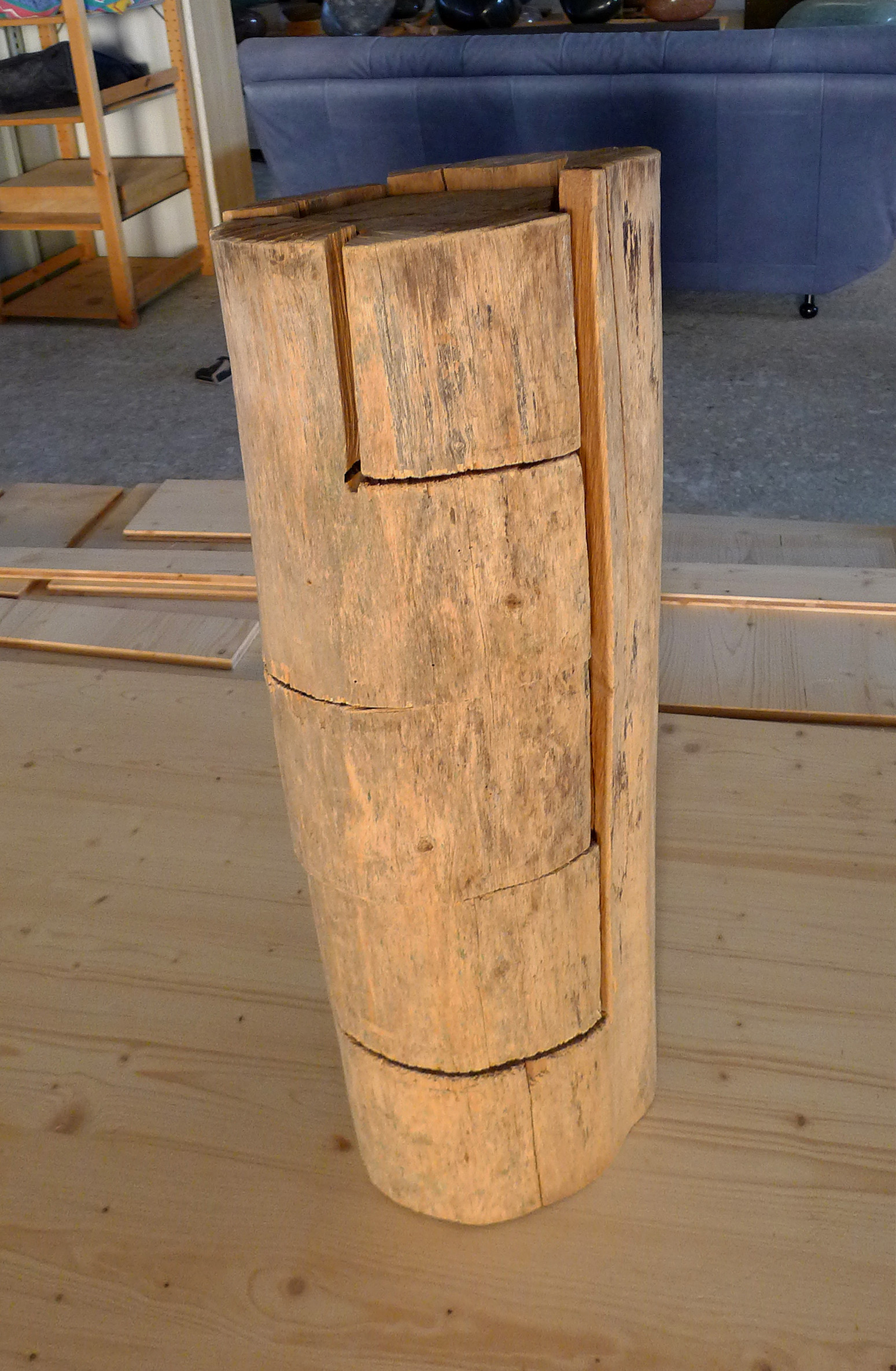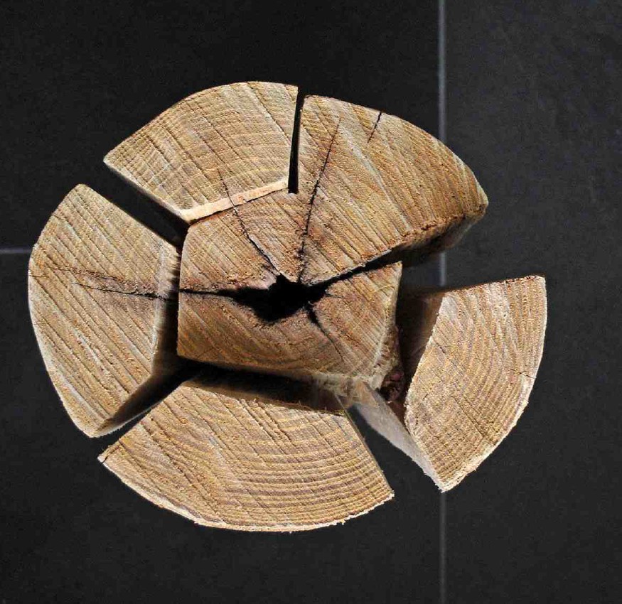 1995 machte ich die erste fünfteilige Skulptur aus einem geschälten, schweren Stück Robinienholz. Bis zur zweiten Hackordnung vergingen mehr als zwanzig Jahre. Das künstlerisch mit Säge und Beil geordnete Holz Spalten habe ich an verschiedenen Rundhölzern in Längen von wenigen Zentimetern bis zu einem Meter variiert.