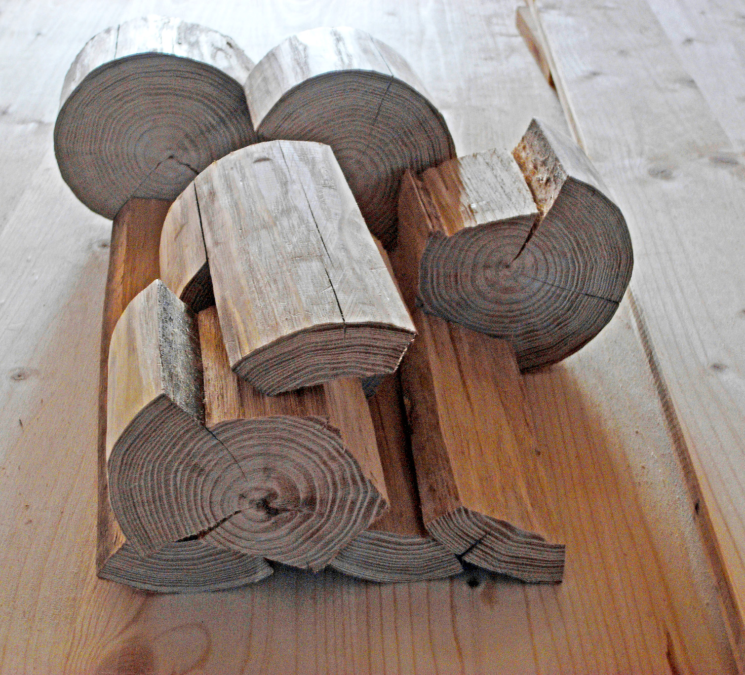 Bezogen auf die Hackordnung -Skulpturen zeigt die Aussenseite der zusammengefügten Rundhölzer mit den rechtwinklig angelegten Linien eine andere Ordnung als die Summe der losen Teile.
