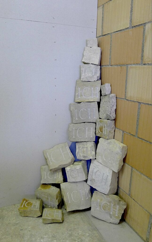 Ich habe in den Bergen der Umgebung lose, viereckige Steine* aus geborstenen Kalksteinfelsen gesammelt, um in meiner Werkstatt das Wort «ICH» hinein zu meisseln.