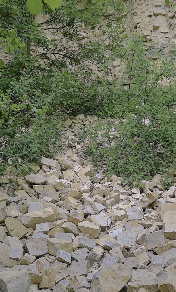 Die Steine mit dem eingravierten «ICH» bringe ich zurück an die Orte, wo sie herkommen, um sie im Schuttkegel platziert zu fotografieren. Die Steine, die losgelöst voneinander im Schuttkegel unterhalb vom gewachsenen Fels liegen, erinnern mich an eine gewachsene Gemeinschaft, die durch Ego-getriebene Sprengkraft zerfällt.