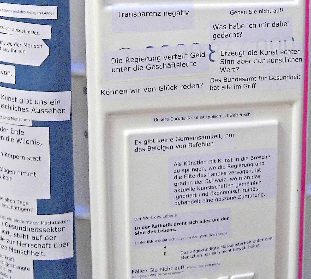 Die #coronakunstglarus -Ausstellung war 2020 im öffentlichen Kulturbetrieb weitherum eine exotische Besonderheit, weil die Kommunikation unter den Besucherinnen und Besuchern frei und weitgehend unzensiert stattfinden konnte.