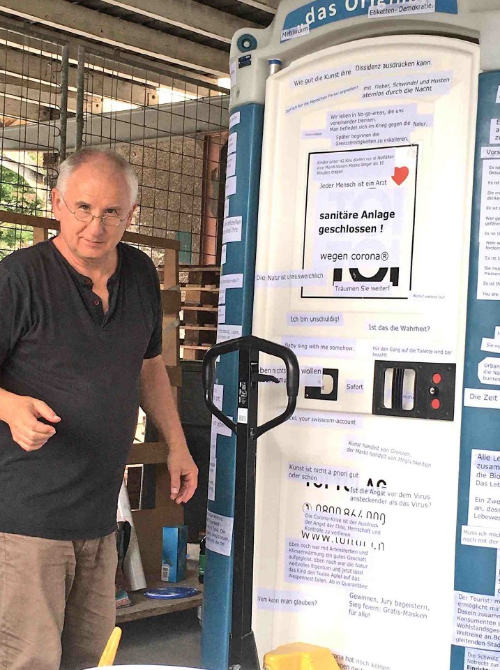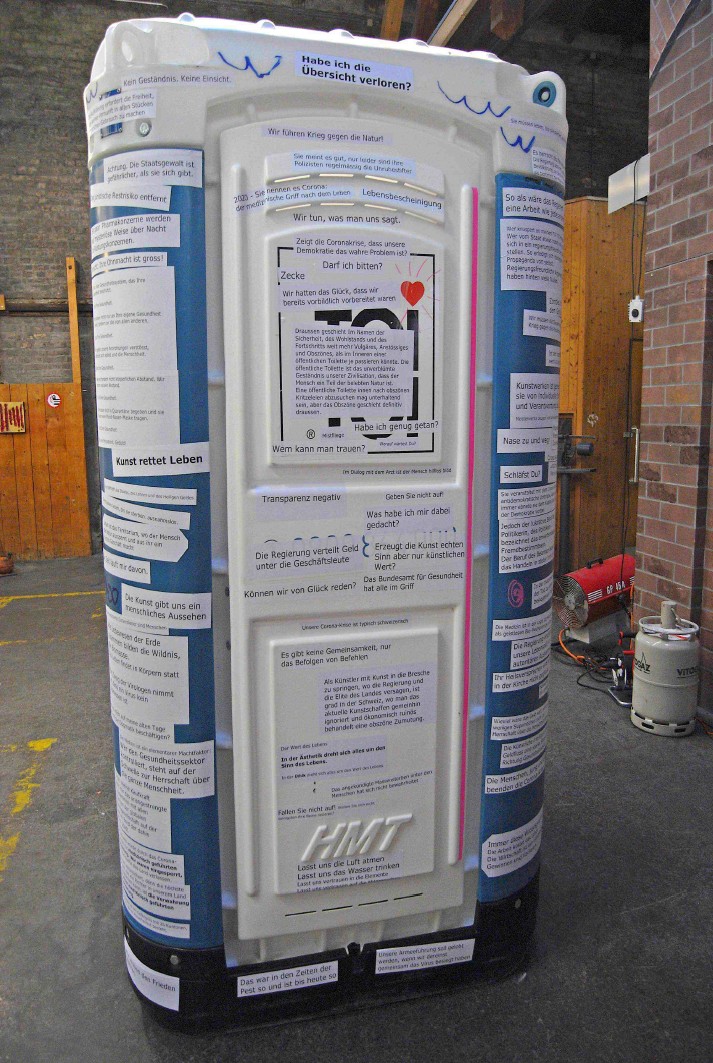 „Sanitäre Anlage geschlossen“ – Textcollage, appliziert auf TOI-TOI-Toilette 2020